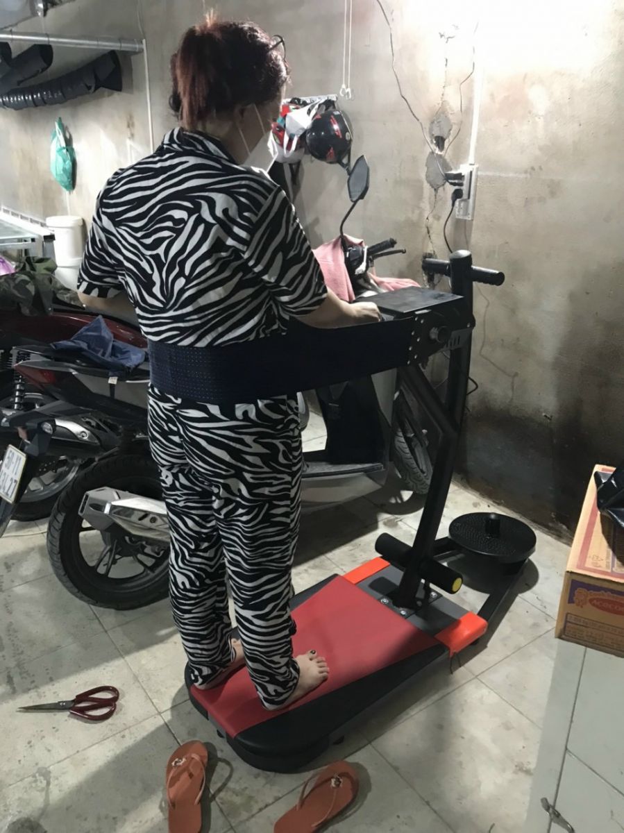 - Hơi ngả người về phía sau (như hình minh họa) để tạo độ căng cho dây đai, giúp lực rung tác động sâu nhất.